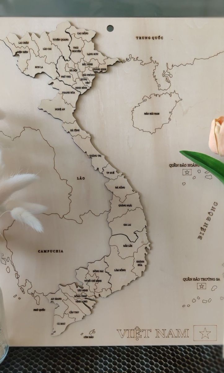 Bản đồ treo tường được chế tác bằng công nghệ khắc laser hiện đại, mang đến từng đường nét sắc sảo, chi tiết và bền đẹp theo thời gian. Đây không chỉ là vật trang trí, mà còn là một tác phẩm nghệ thuật đầy ý nghĩa.